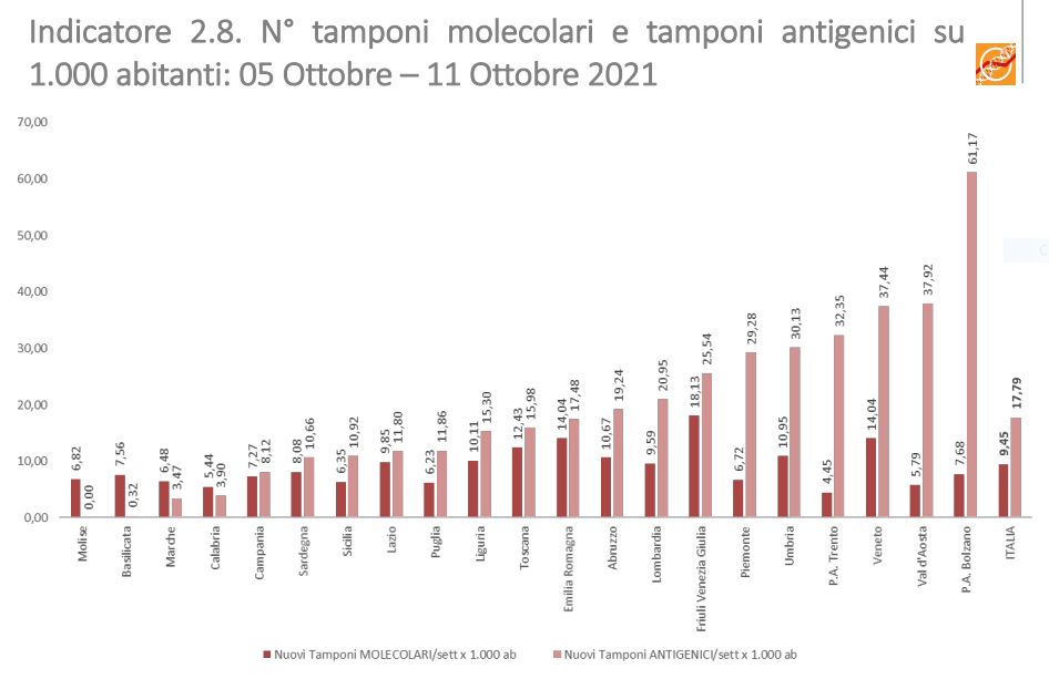 Dal report arriva poi una fotografia della produzione di antigenici e molecolari “lavorati” da farmacie e laboratori nella settimana che va dal 5 all’11 ottobre: svetta la provincia di Bolzano, che arriva a 61,7 test rapidi ogni mille abitanti; seguono a distanza Veneto e Val d’Aosta (oltre 37 tamponi in una settimana, sempre ogni mille abitanti), quindi le altre. Conclusione, «l’obbligo del green pass richiederà una grande sfida economica e organizzativa» dice Americo Cicchetti, direttore dell’Altems.