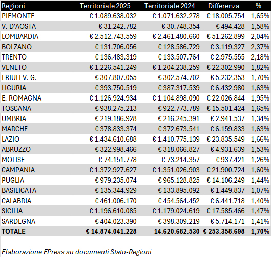 La somma che dal riparto viene assegnata alla farmaceutica territoriale – 14,874 milioni – risulta superiore dell’1,7% al finanziamento per il 2024. Gli stanziamenti assegnati alle diverse Regioni, tuttavia, comportano incrementi differenti da caso a caso: va meglio a Lombardia e alle due province autonome di Trento e Bolzano, il cui fondo risulta in crescita di poco più del 2% rispetto al 2024, non saltano di gioia invece Molise e Umbria, che sul 2024 prendono tra l’1,2 e l’1,3% in più (vedi tabella sotto). Come si ricorderà, nel 2025 il tetto per la spesa farmaceutica convenzionata vale il 6,80% del Fondo sanitario nazionale.
