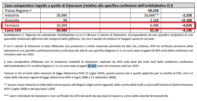 Per scendere nel concreto, il data check dell’Aifa ripropone le stime dell’articolo di Dataroom corrette in base ai propri dati. Come detto, l’analisi del Corriere della Sera prende a riferimento una specifica confezione di antidiabetico e la spesa sostenuta per la sua distribuzione da parte di una certa Regione, dove nel periodo settembre-novembre 2025 sono state distribuite di tale referenza 58.569 scatole. Individuato il farmaco, l’Aifa propone quindi le sue cifre (vedi sotto), che differiscono significativamente da quelle dell’articolo.