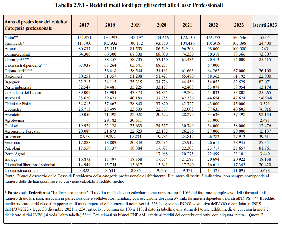 La classifica prende in considerazione le dichiarazioni rese dalle diverse categorie nel periodo compreso tra il 2017 e il 2023, con varie approssimazioni legate alle fonti. Nel caso dei farmacisti, per esempio, la fonte è la pubblicazione annuale di Federfarma “La farmacia italiana” e il reddito medio è stato calcolato facendo un rapporto tra il 10% del fatturato complessivo delle farmacie e il totale dei titolari, soci, associati in partecipazione e collaboratori familiari, esclusi i 57mila farmacisti iscritti all’Inps. Il valore indicato dal rapporto riguardo ai farmacisti titolari, dunque, è una stima che rischia di non riflettere del tutto la realtà delle cose, ma consente comunque qualche osservazione.